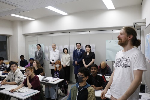 文部科学省日本語教育課・国際教育課の職員14名の方が、当校での日本語教育と国際理解・地域交流に関する教育を視察するために来校されました。